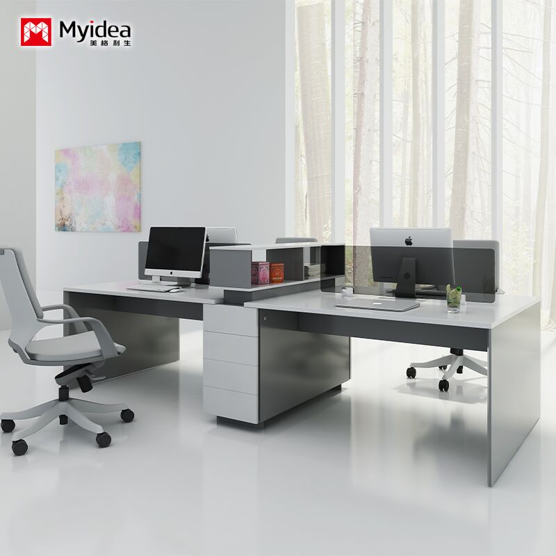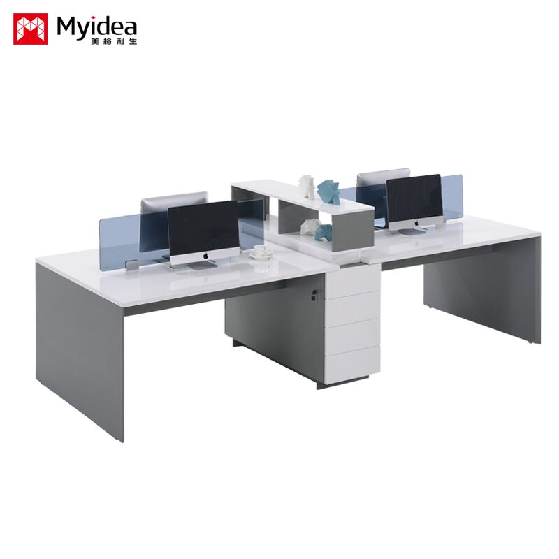 Mesa de escritório de 4 pessoas com gavetas de armazenamento, escritório pintado de branco brilhante